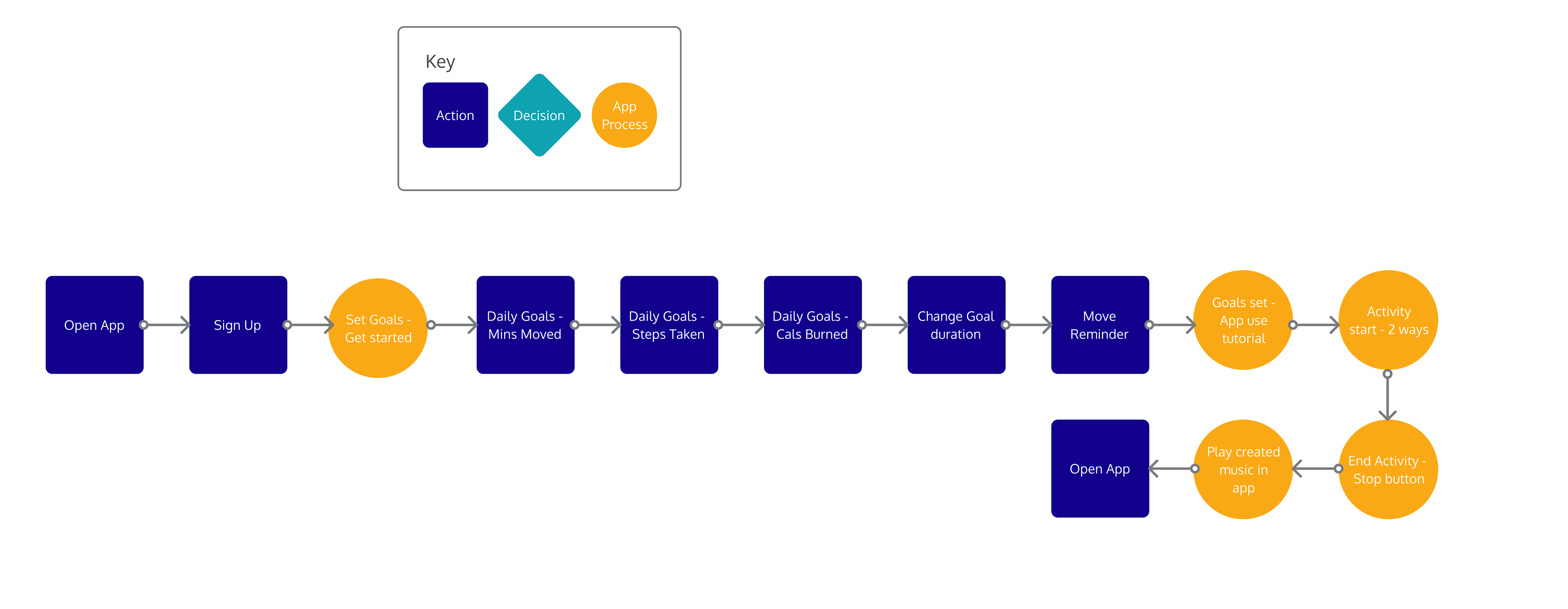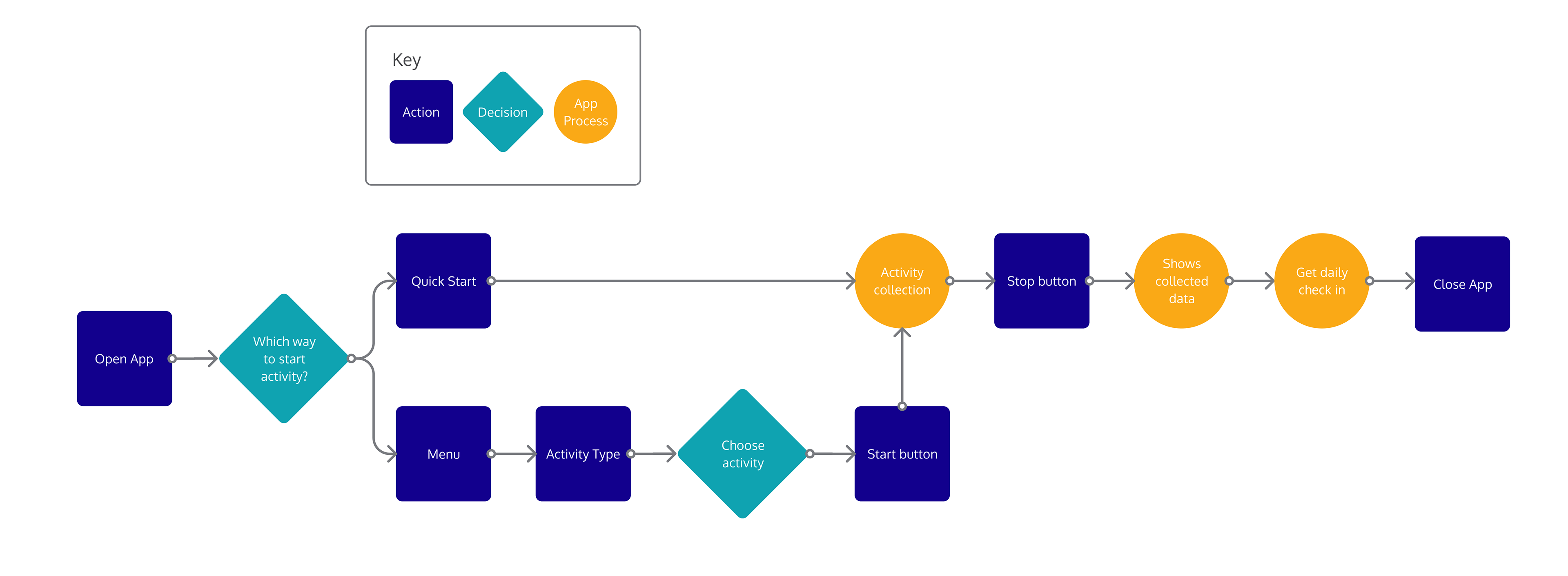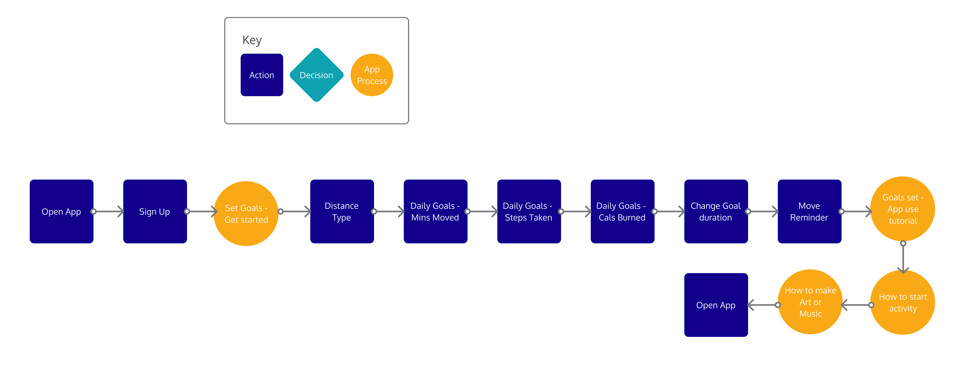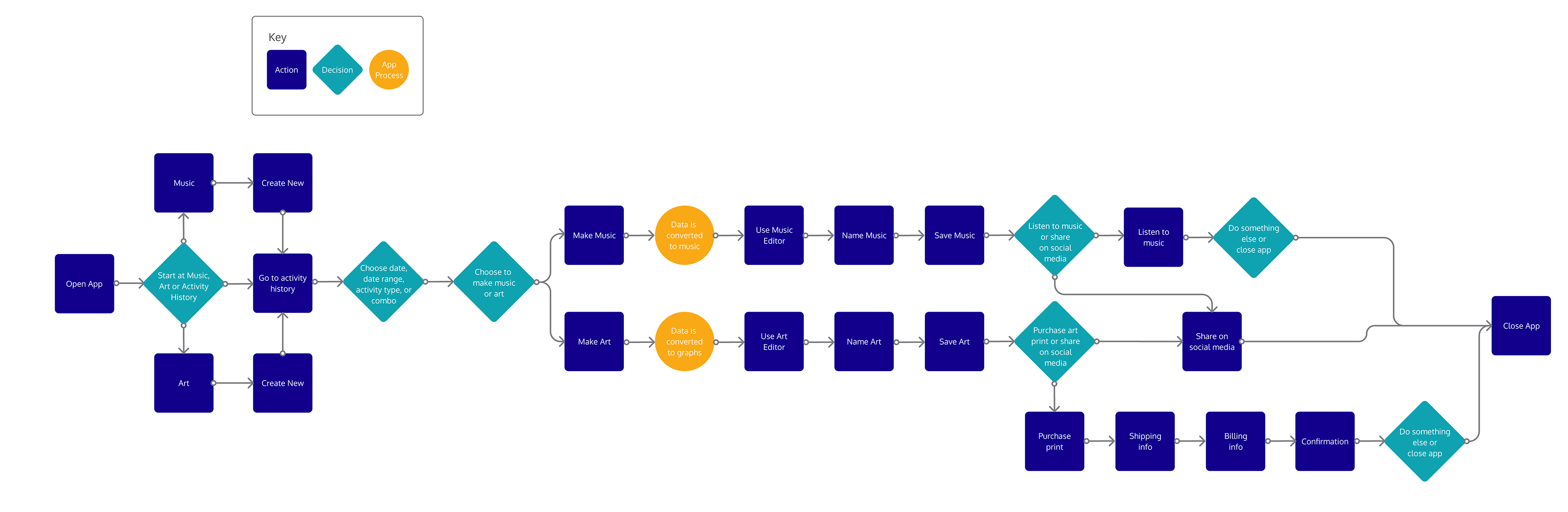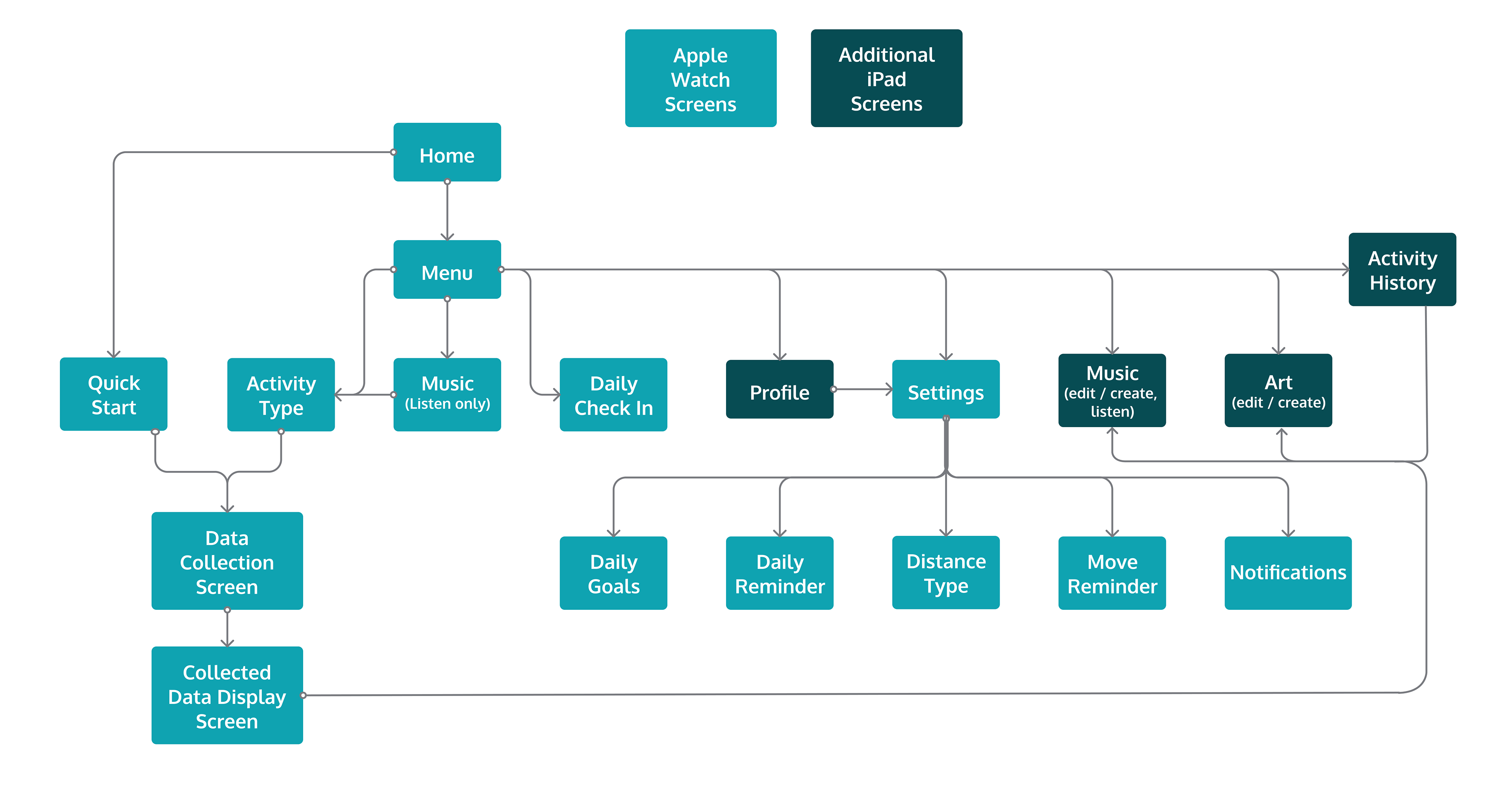 I started with making user flows to see what screens I would need. Since a user would first need to do activity to collect data, which would be used to make art or music, I made the user flow for the Apple Watch first and the iPad second.